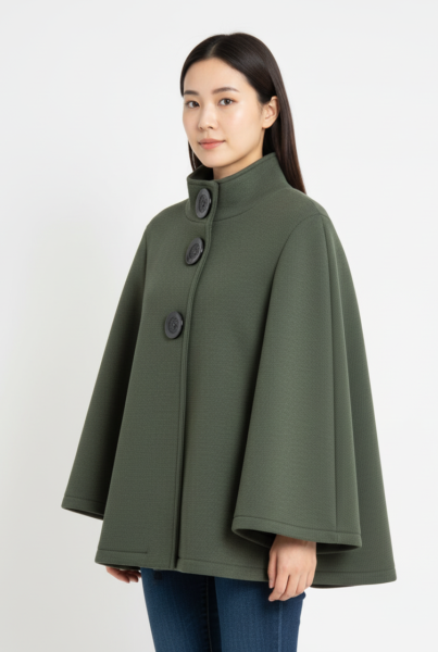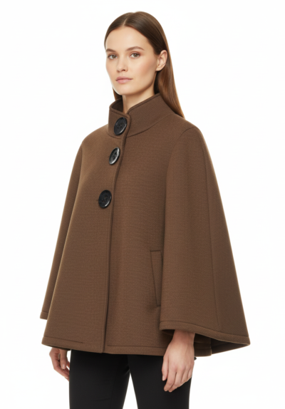 Capa corta de tejido estructurado con cuello chimenea y cierre frontal de tres grandes botones decorativos. Silueta amplia tipo poncho, manga caída y bolsillos laterales discretos para un look elegante y cómodo en el día a día.Talla L