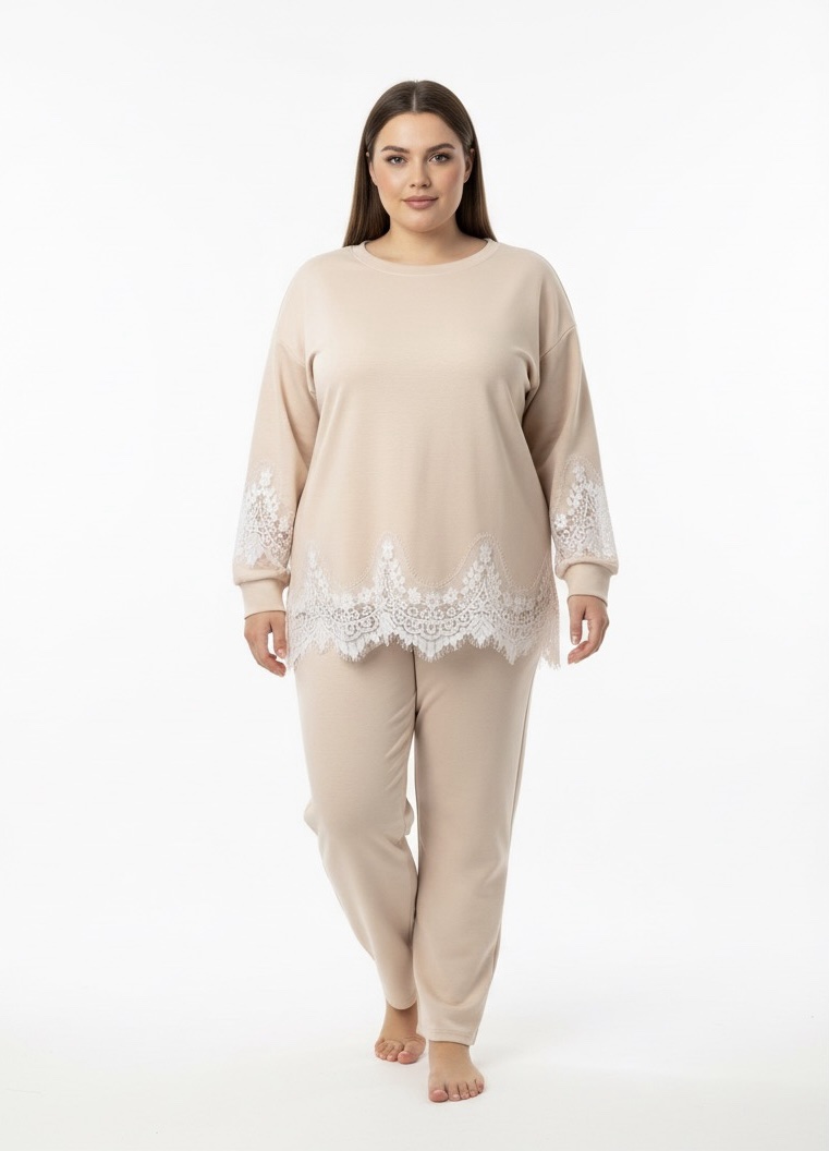 Es un conjunto elegante en tono beige claro, ideal para el día a día.