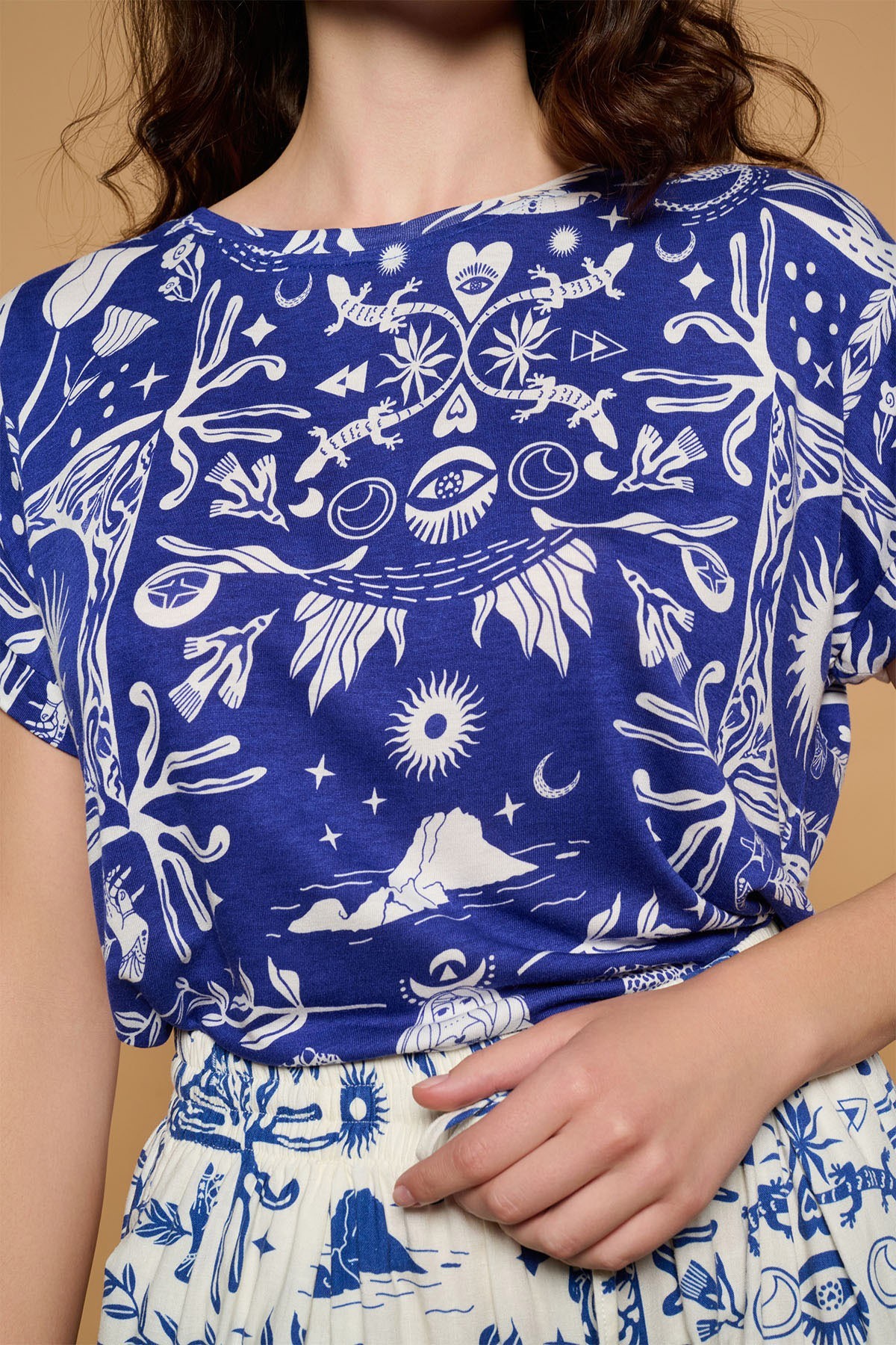 Camiseta de cuello redondo y manga corta acampanada. Estampado místico sobre fondo azul. Tejido 100% viscosa.