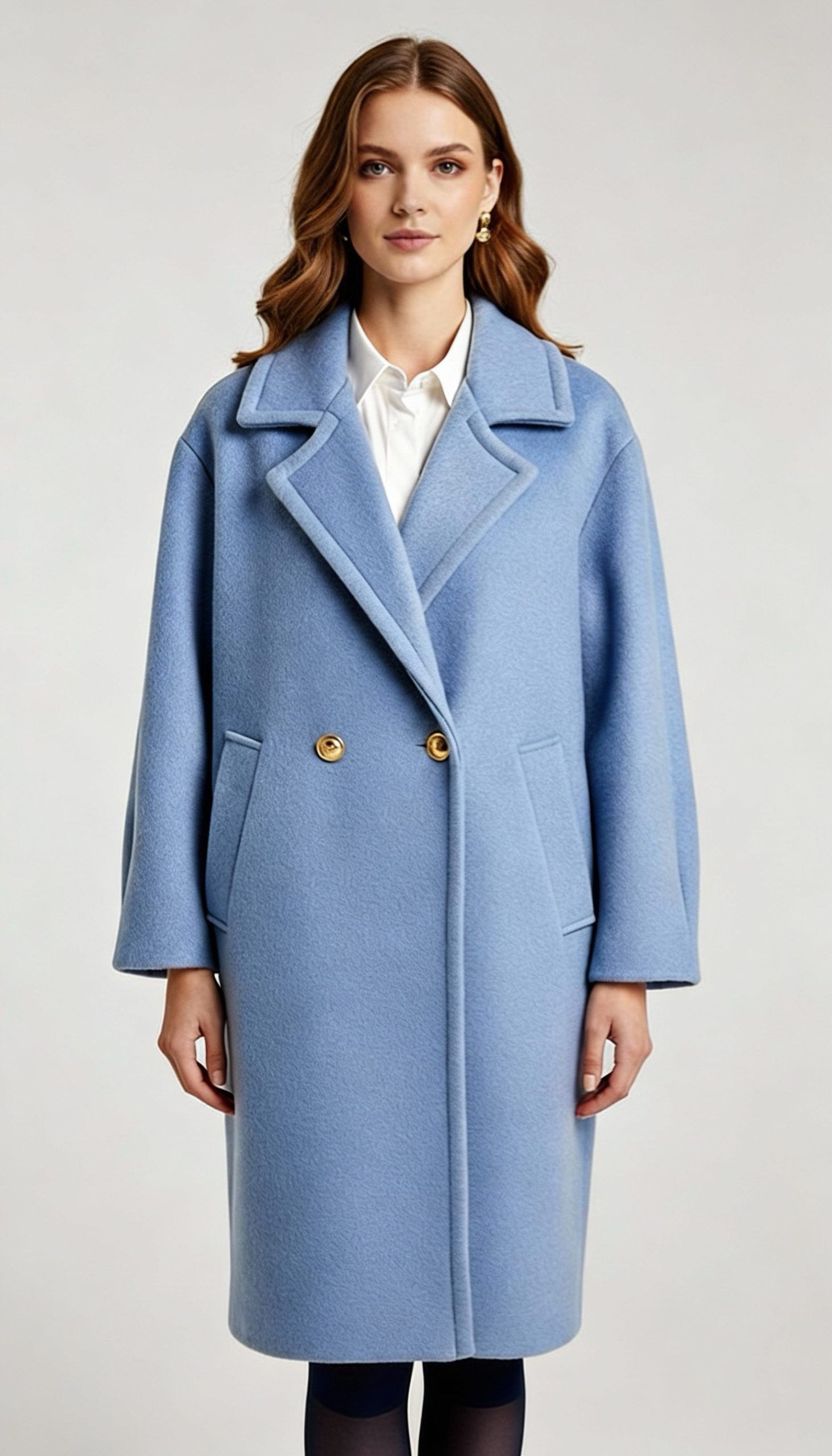 Abrigo oversize en tono azul claro suave ofrece un corte amplio y elegante con doble botonadura dorada, cuello solapa estructurado y bolsillos laterales funcionales. Ideal para looks urbanos de invierno, combina calidez con estilo minimalista y se adapta perfectamente a jeans o faldas midi.