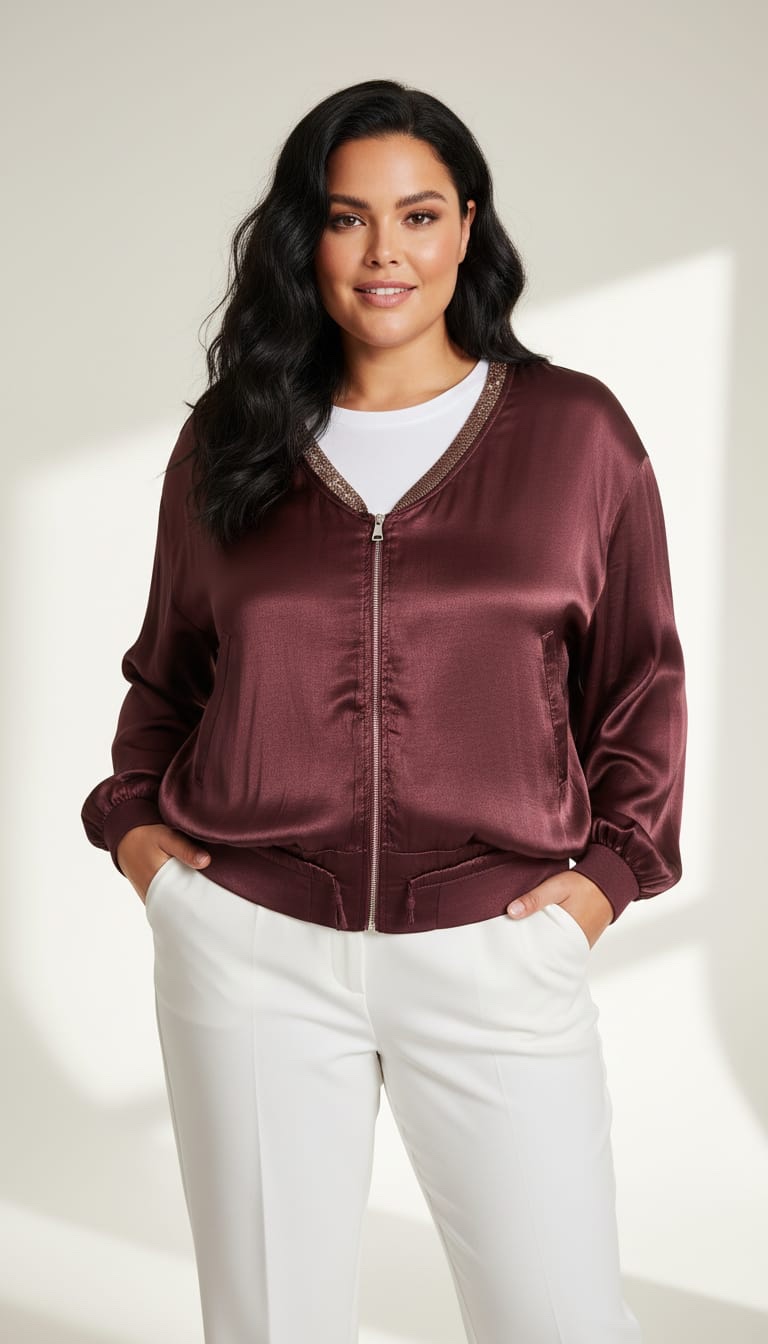 Esta chaqueta destaca por su diseño elegante y versátil, ideal para looks modernos y sofisticados. Se trata de una prenda oversize en satén de color burdeos intenso, con mangas abullonadas que aportan volumen y feminidad.