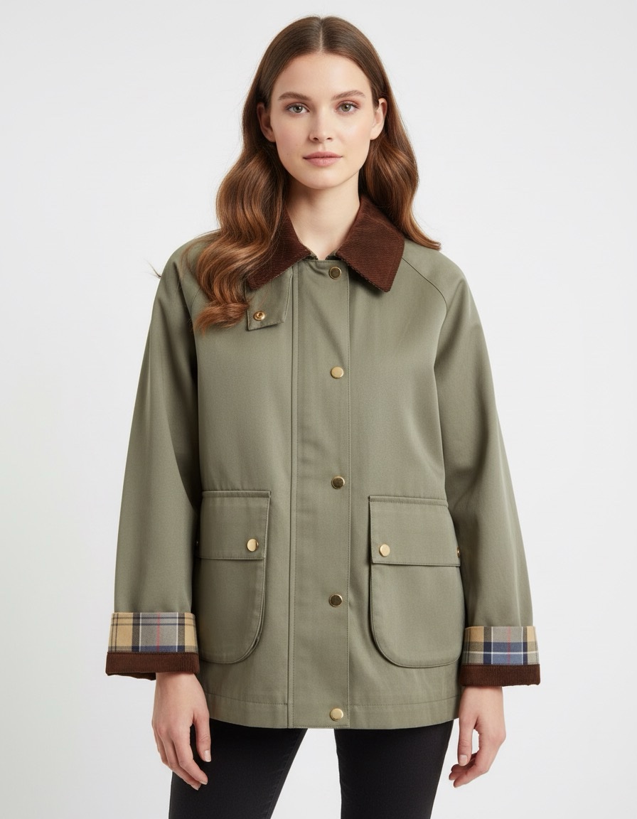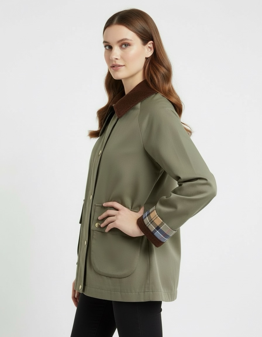 Abrigo tipo cazadora recta en color verde oliva, con cuello de pana marrón, bolsillos delanteros con solapa y broches dorados, y vuelta de puños con forro de cuadro tartán visible para un toque clásico y elegante.