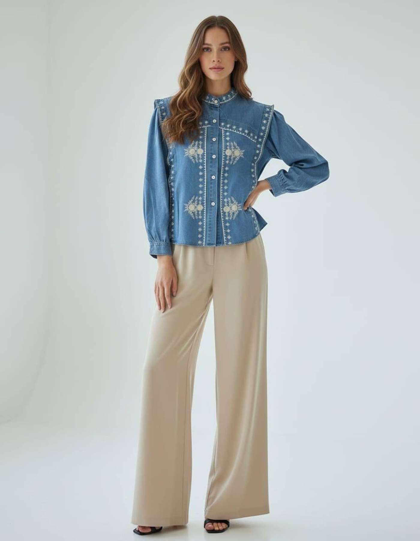 Camisa denim azul con bordados geométricos blancos y mangas globo. Ideal para ocasiones semi-formales con toque boho chic.