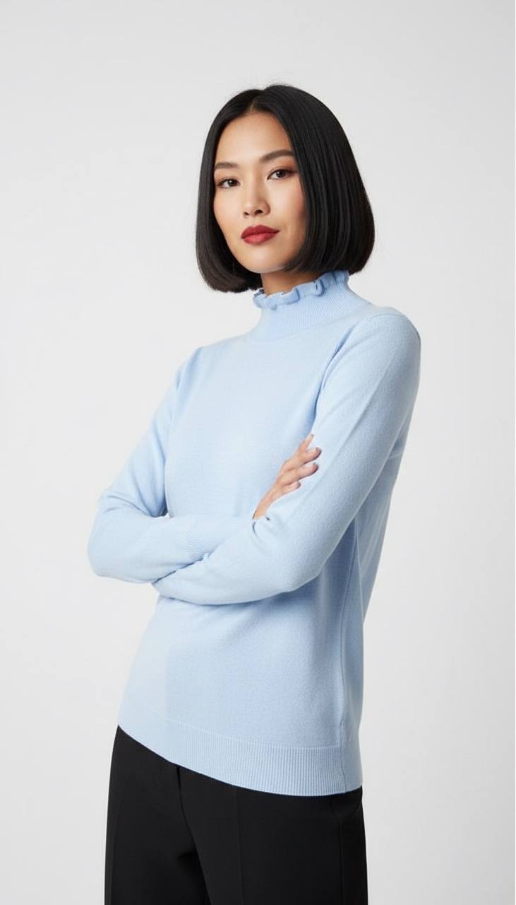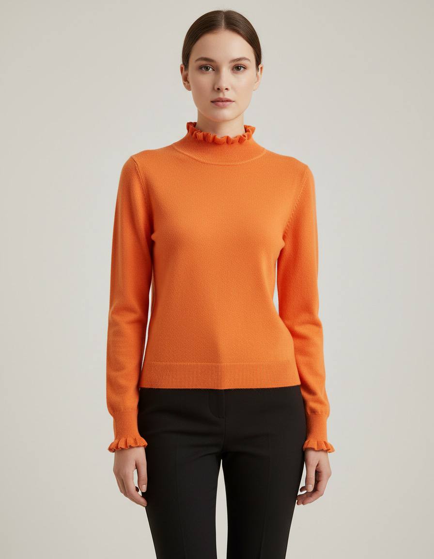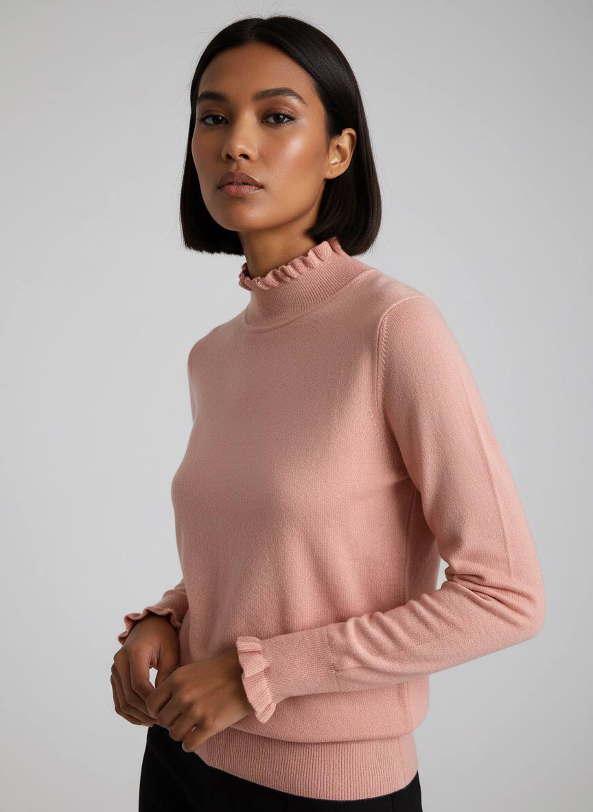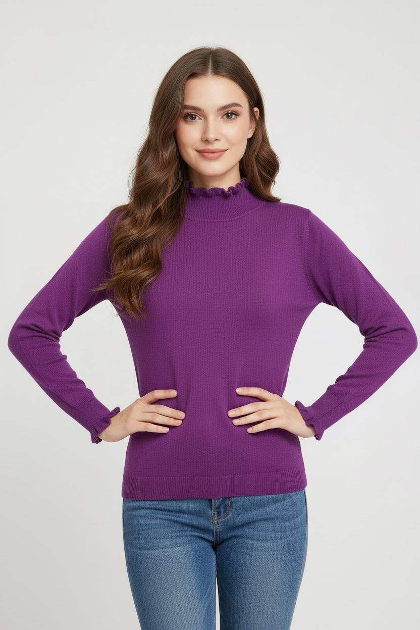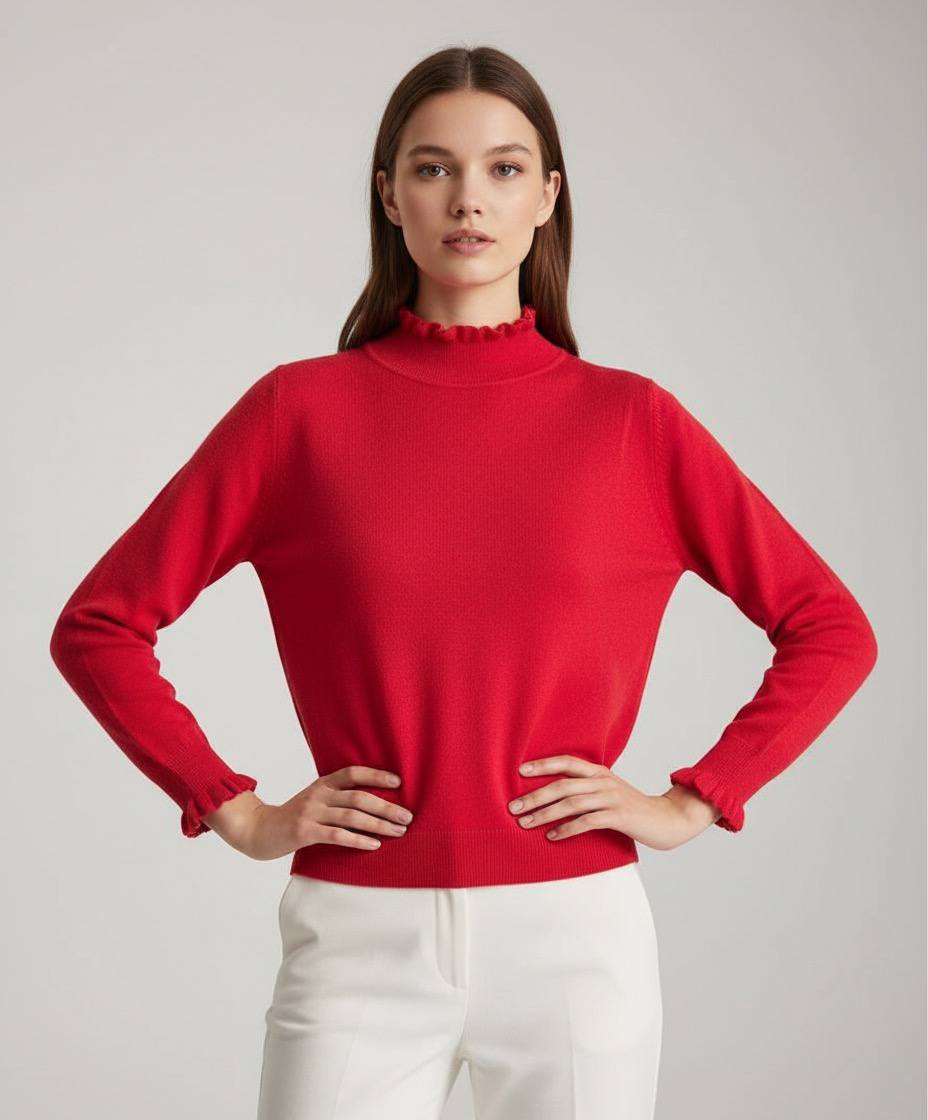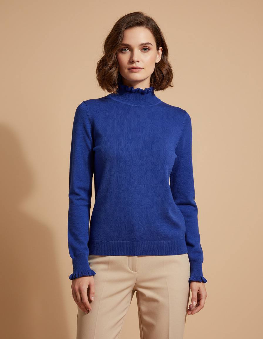Elegante jersey de punto en un vibrantes colores. Cuenta con un cuello alto adornado con volantes delicados que aportan un toque femenino y sofisticado, ideal para looks de oficina o casuales.Las mangas largas terminan en puños con volantes a juego, ofreciendo un corte recto y favorecedor que se adapta cómodamente al cuerpo. Fabricado en tejido suave y elástico, como viscosa, poliéster y nailon, garantiza comodidad todo el día.Perfecto para combinar con pantalones negros ajustados o faldas midi, este jersey versátil eleva tu estilo invernal con calidez y tendencia. Disponible en talla unica (S/M) para un ajuste impecable