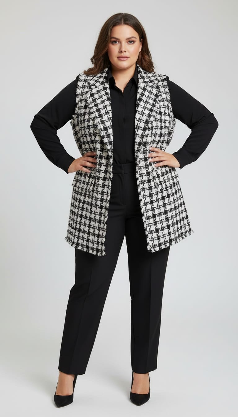 Es un chaleco sin mangas oversize para mujer, con un estampado clásico de pata de gallo (houndstooth) en blanco y negro. Presenta solapas anchas, escote en pico y un corte holgado que lo hace ideal para combinar con pantalones negros ajustados