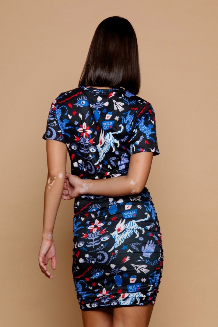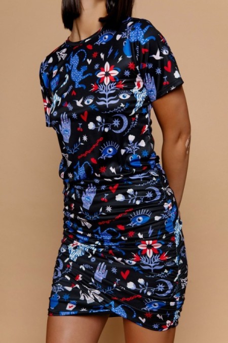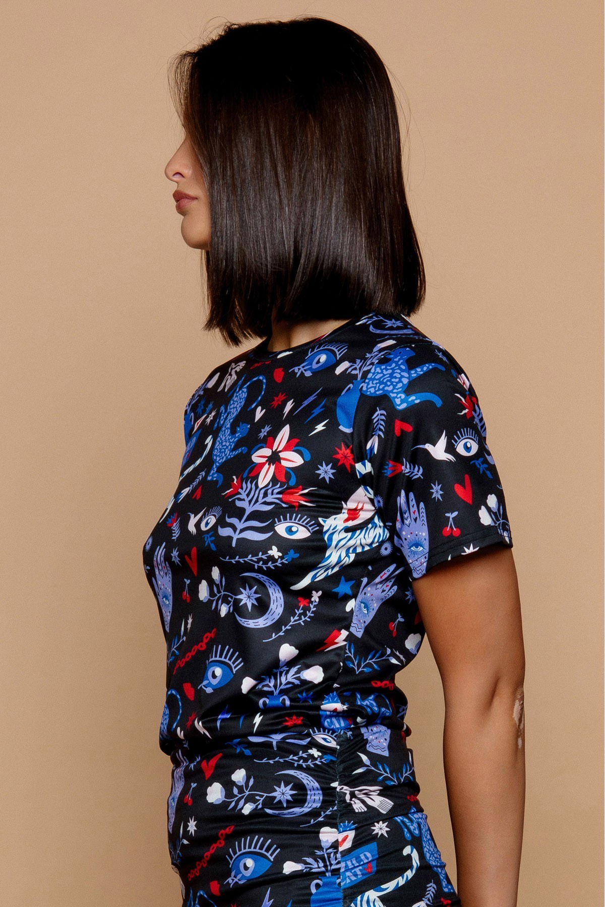 Camiseta de cuello redondo y manga corta. Estampado místico. Tejido elástico.