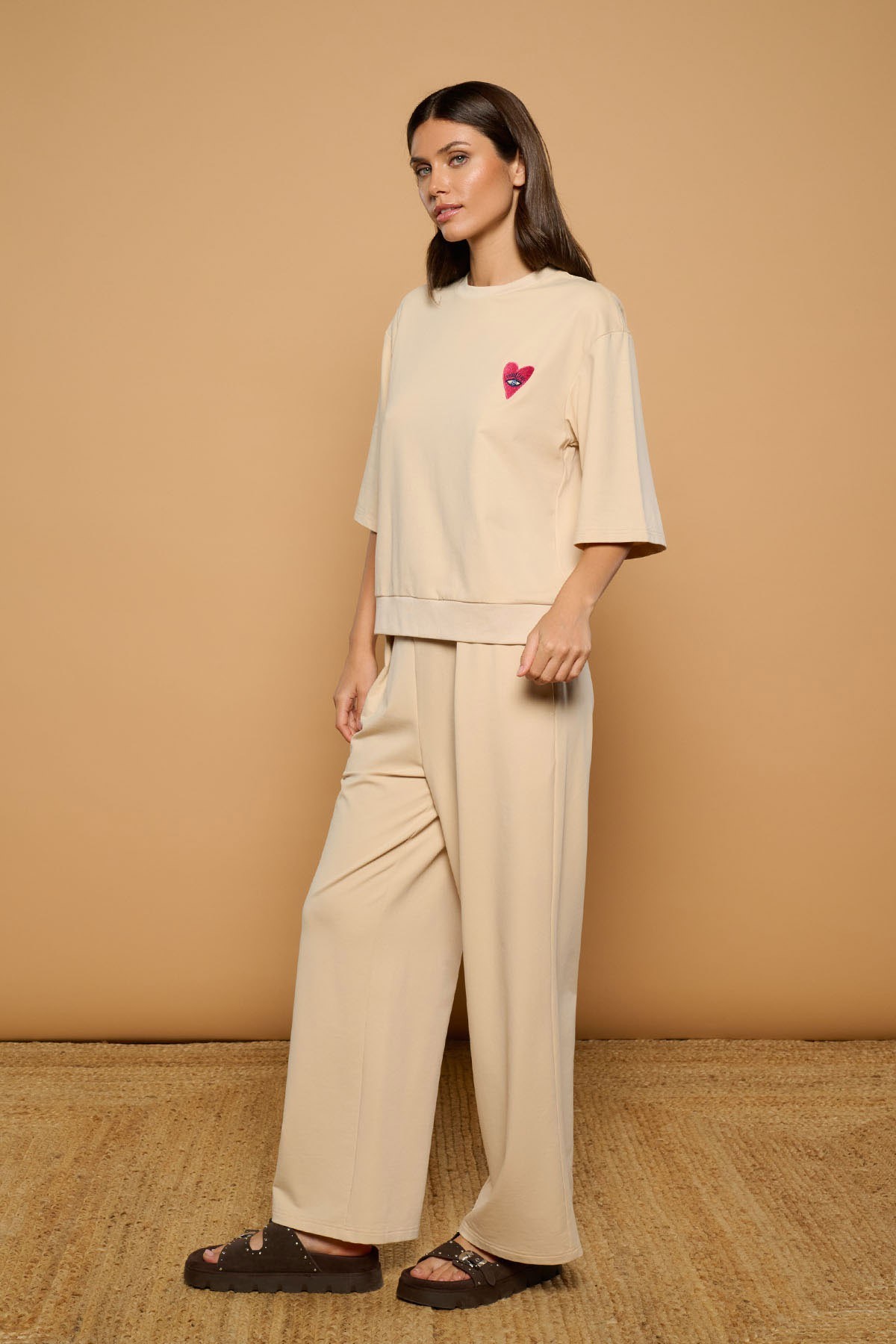 Sudadera de cuello redondo y manga francesa acampanada. Detalle de corazón místico bordado en frontal. Detalle de logo y salamanquesas y corazones de colores bordados en espalda. Tejido mezcla de algodón.
