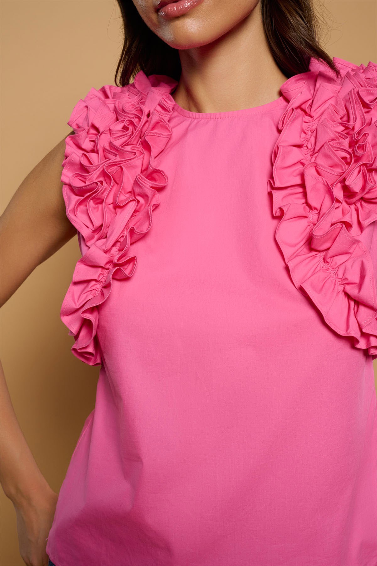 Camiseta de cuello redondo y manga sisa. Cierre con cremallera trasera. Volantes fruncidos en sisas. 100% algodón.
