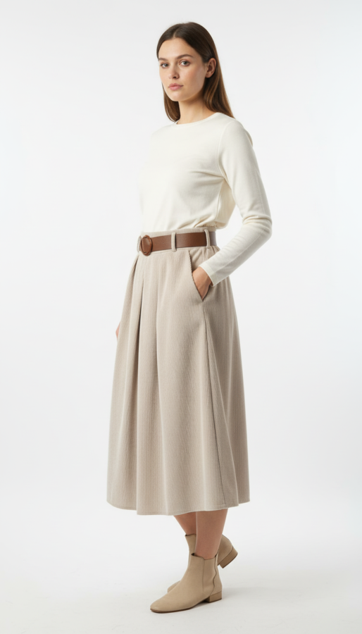 Falda plisada midi de corduroy morado con cinturón de cuero marrón ajustable y hebilla metálica oversized. Pliegues fluidos y caída elegante para looks casuales o formales. Tejido cálido ideal para entretiempo.