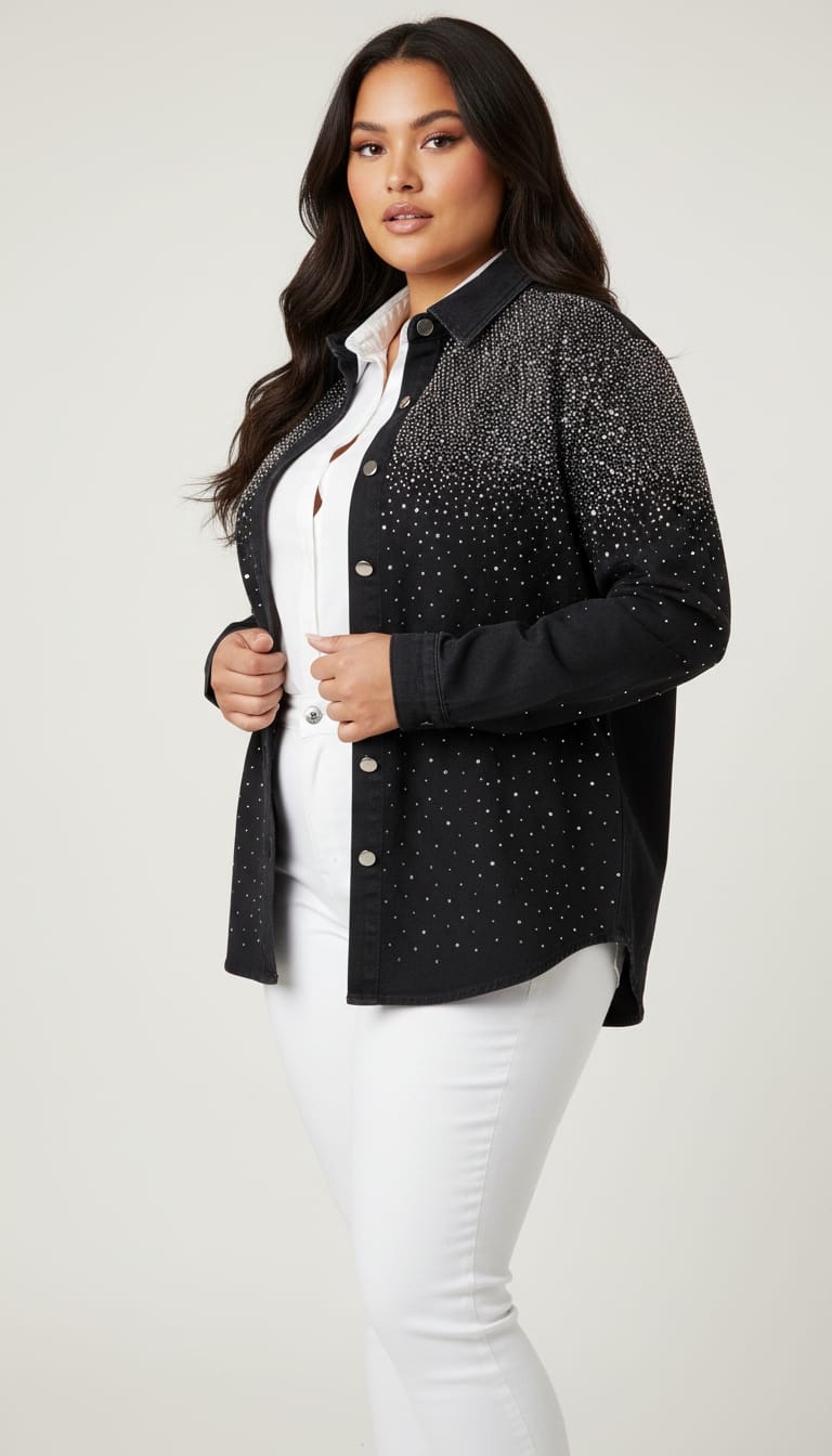 Camisa oversize vaquera de corte moderno con un diseño elegante y brillante. Destaca por su degradado de cristales en tonos plateados sobre base negra, ideal para looks nocturnos o casuales sofisticados. Cuello clásico, mangas largas y silueta holgada que favorece siluetas curvy