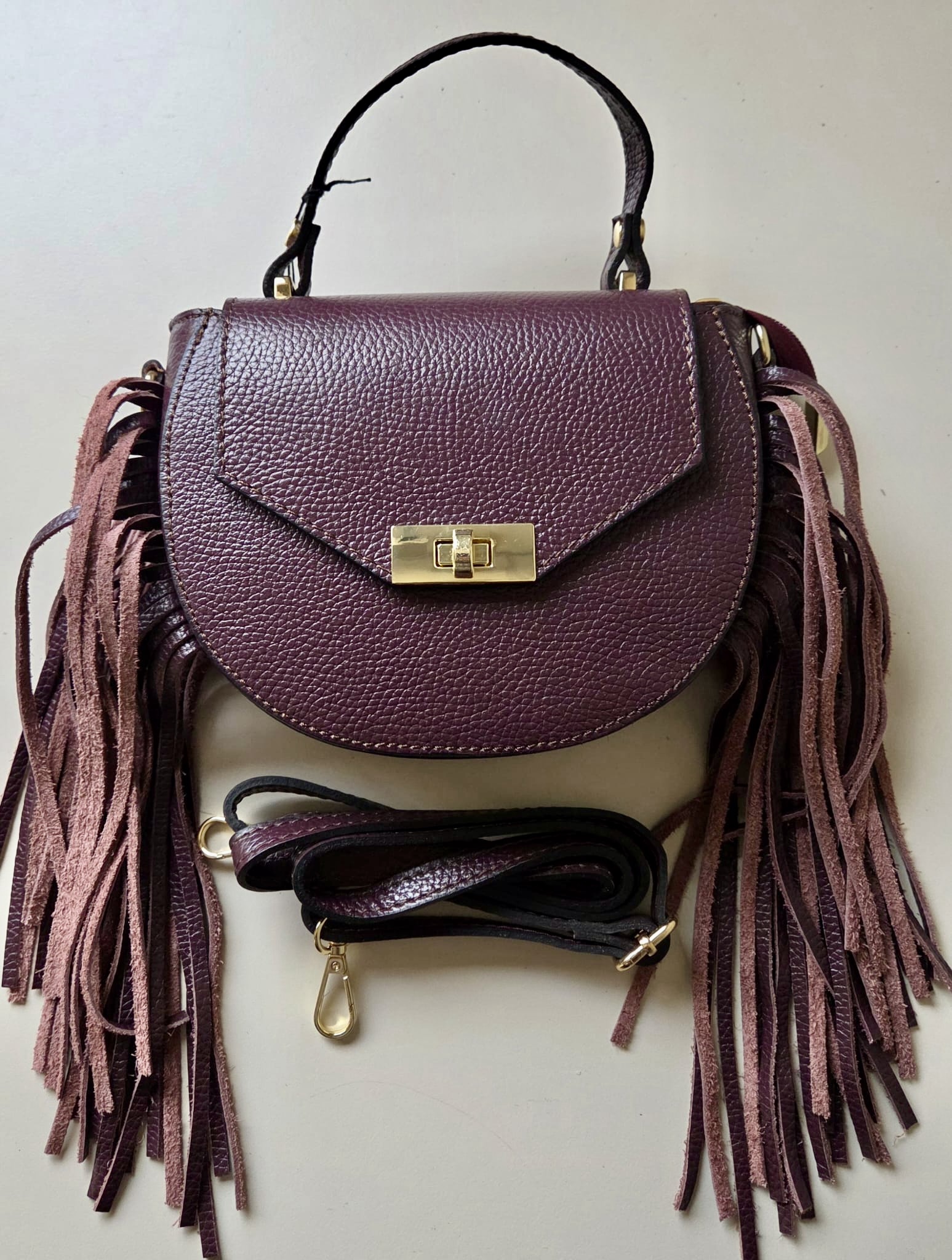 Este bolso destaca por su diseño circular moderno y elegante, fabricado en cuero suave color marrón con flecos decorativos que aportan un toque boho chic.